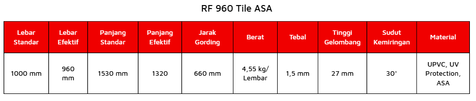 Agar Anda bisa merencanakan renovasi dengan matang, penting untuk mengetahui detail ukuran material ini. DR.SHIELD menghadirkan tipe genteng UPVC RF 960 Tile ASA yang didesain khusus agar pas dengan kebutuhan rumah tinggal. Berikut adalah spesifikasi per lembarnya: