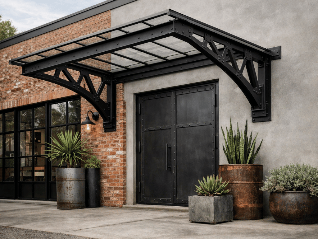 Beberapa desain kanopi tanpa tiang sengaja menonjolkan rangka besinya sebagai elemen dekoratif. Rangka yang terlihat ini memberi kesan industrial yang kini banyak diminati, terutama untuk rumah bergaya semi-modern atau kontemporer. Meski rangkanya terlihat, strukturnya tetap mengandalkan dinding sebagai titik tumpu utama.
