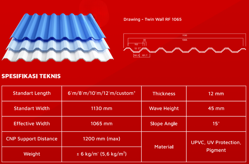 Untuk memberikan gambaran yang lebih konkret, berikut adalah contoh spesifikasi dari salah satu produk atap UPVC DR.SHIELD seri Twin Wall RF 1065 :