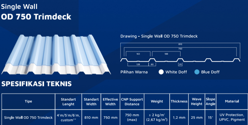 Sebagai perbandingan, berikut spesifikasi dari atap UPVC DR.SHIELD seri Single Wall OD 750 Trimdeck: